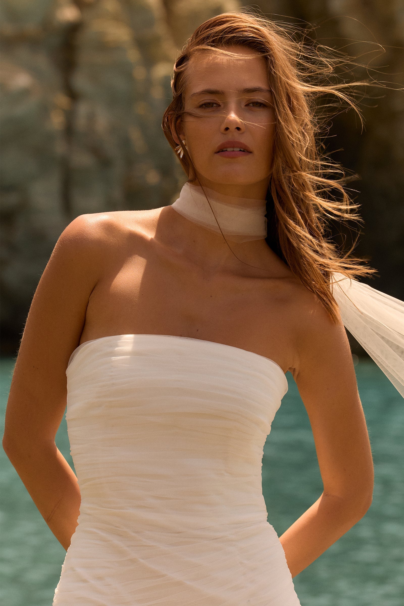 Mya ist elegant und ausdrucksstark und erweckt Ihre Brautträume zum Leben. Sie ist dafür gemacht, die Blicke auf sich zu ziehen, wenn Sie zum Altar schreiten. Dieses trägerlose Brautkleid ist vom Moment des Eheversprechens bis zu Ihrer letzten Drehung auf der Tanzfläche optisch anziehend .