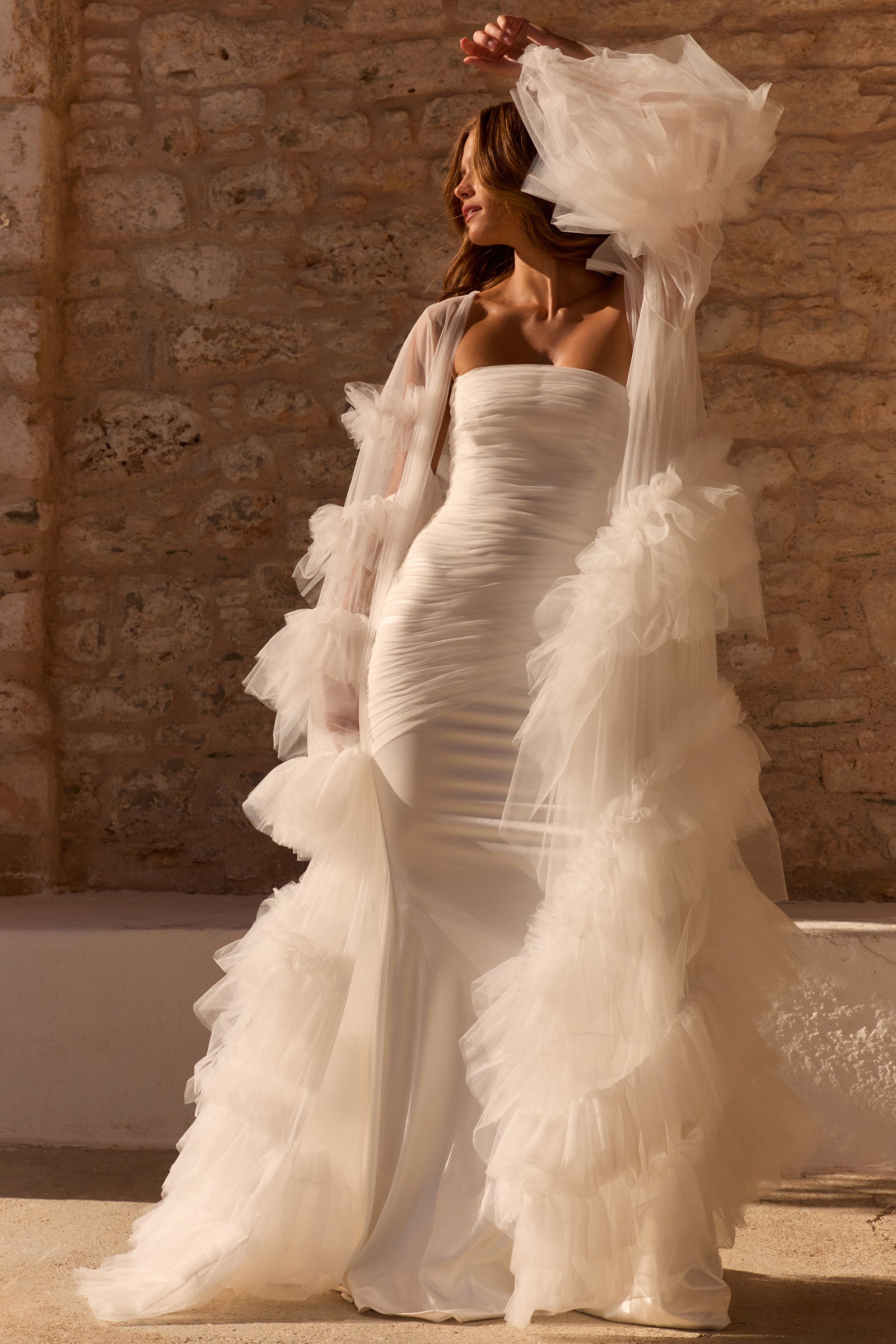 Myas mit Biesen verzierte Tüllfalten Betonen Sie die Figur und schaffen Sie eine schicke Silhouette, die Stunden technischer Fachkompetenz widerspiegelt , während die flexiblen Stäbchen eine skulpturale Silhouette schaffen, die Bewegungsfreiheit bietet .