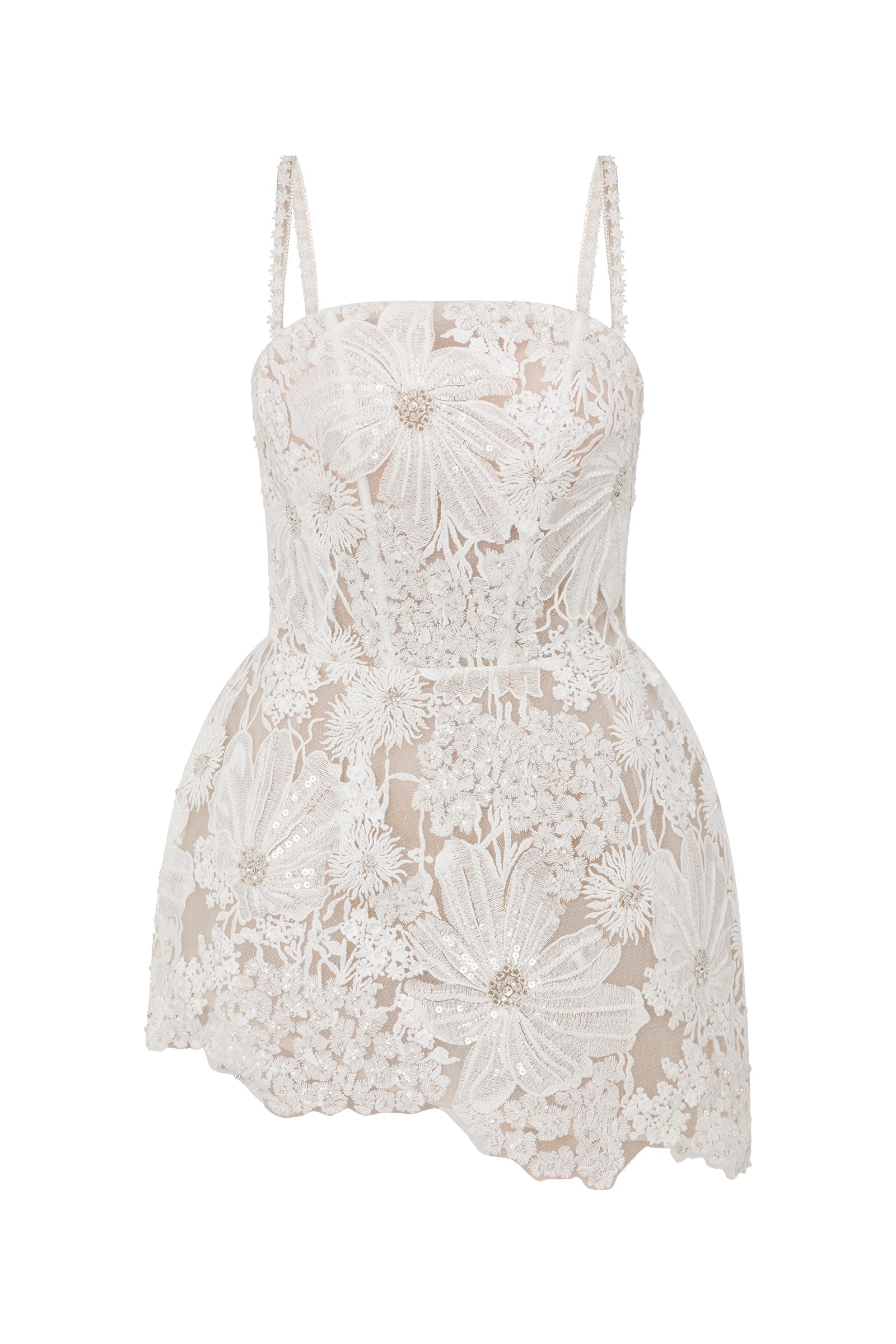 Sie sorgt für Dramatik ohne Anstrengung – ihre aufwendigen, applizierten Motive sind in unsichtbarer Handarbeit gefertigt, jedes einzelne davon strategisch platziert, um ein trägerloses Minikleid zu schaffen, das Ihre Kurven betont.