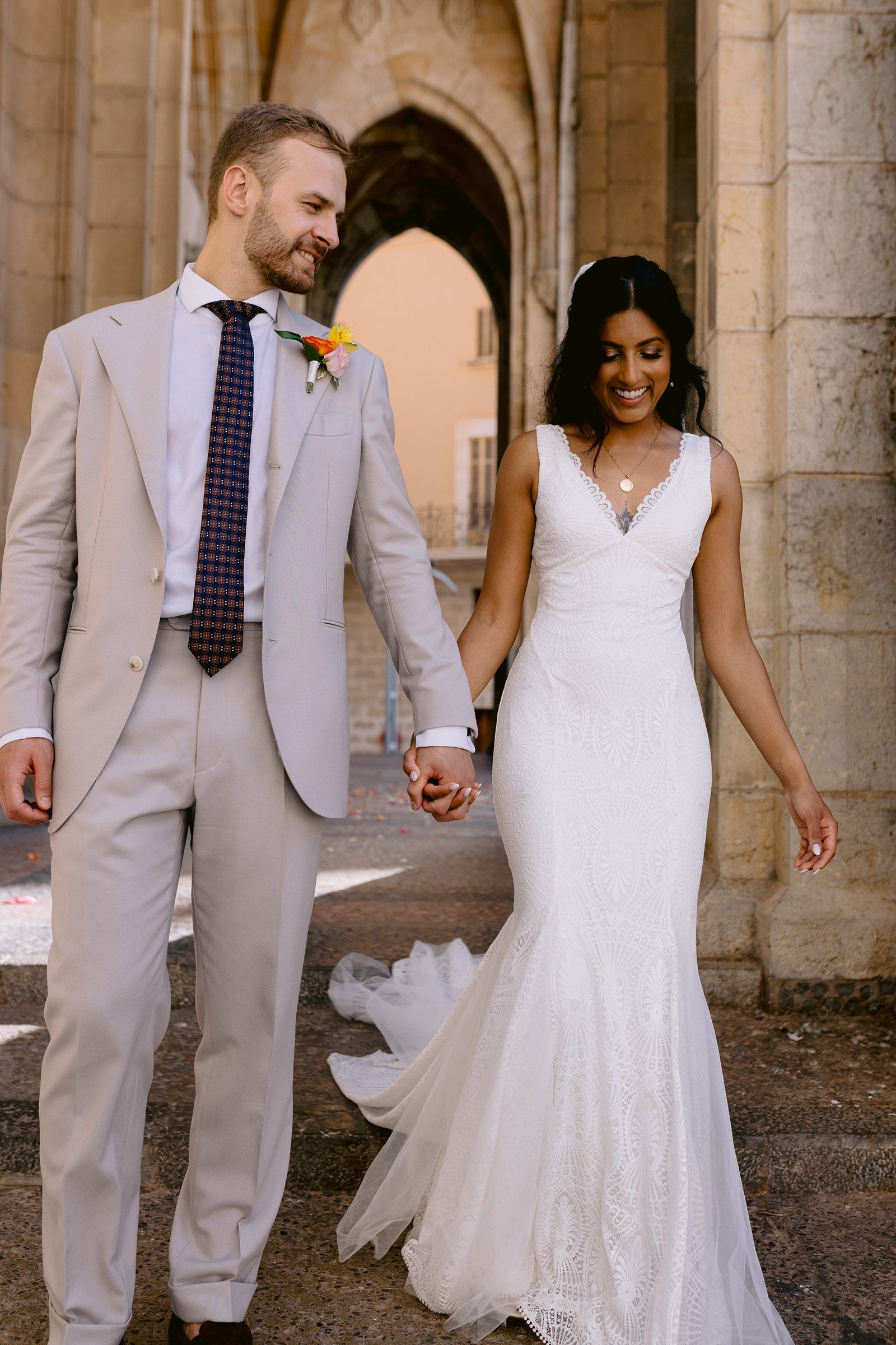 • Ich liebte das Gefühl von Freiheit und Leichtigkeit. Ich wollte mich in einem Brautkleid weder eingeengt noch schwer fühlen, und in meinem Kleid fühlte ich mich so wohl. Die zarten Spitzendetails des Kleides waren wunderschön und ich liebe es, dass es auf meinen Körper zugeschnitten war und ich mir vor meiner Hochzeit keine Sorgen machen musste, ob ich zu- oder abnehmen würde und in letzter Minute Änderungen vornehmen lassen musste.