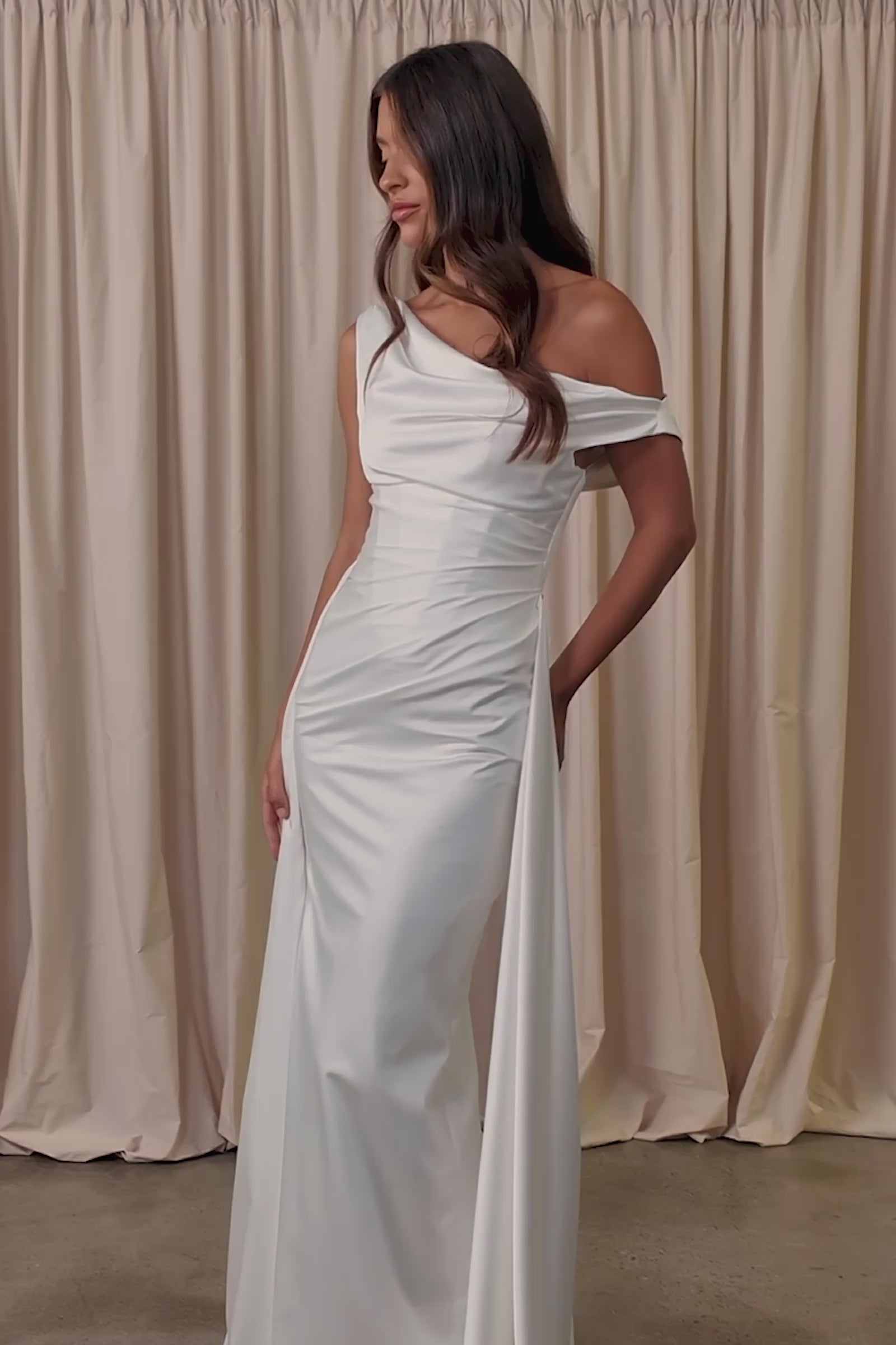 This asymmetrical off-the-shoulder gown is defined by fluid satin draping that sweeps effortlessly across the bodice, framing the décolletage with a sense of relaxed sensuality. The drape continues through the waist, where built-in corsetry works beneath the surface to contour and define the corset wedding dress with subtle structure.