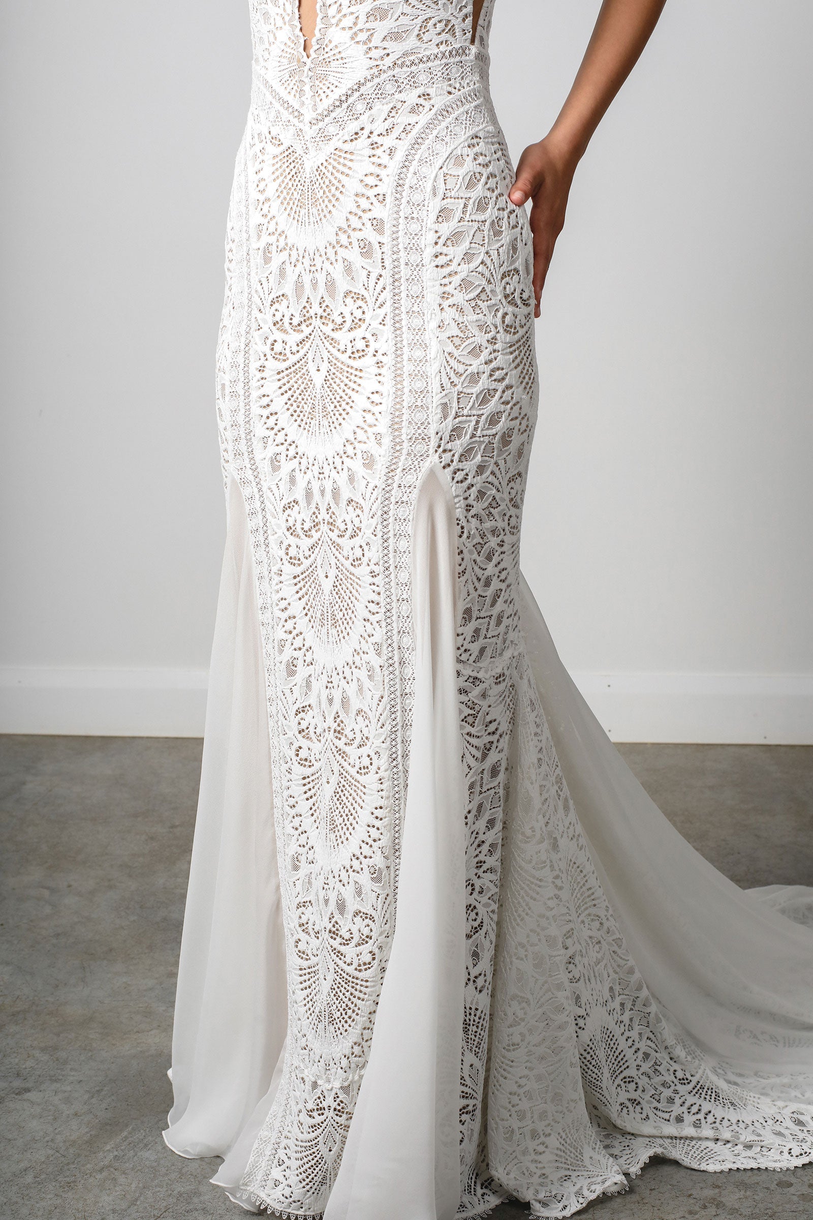 • Silk Chiffon godet inserts, and train create a dimensional layer over the lace