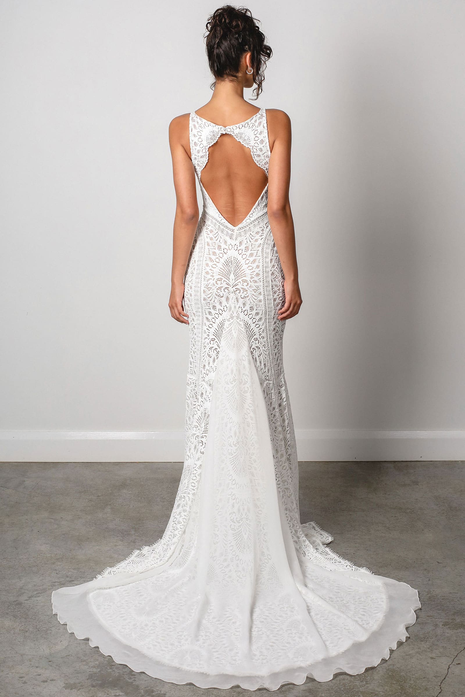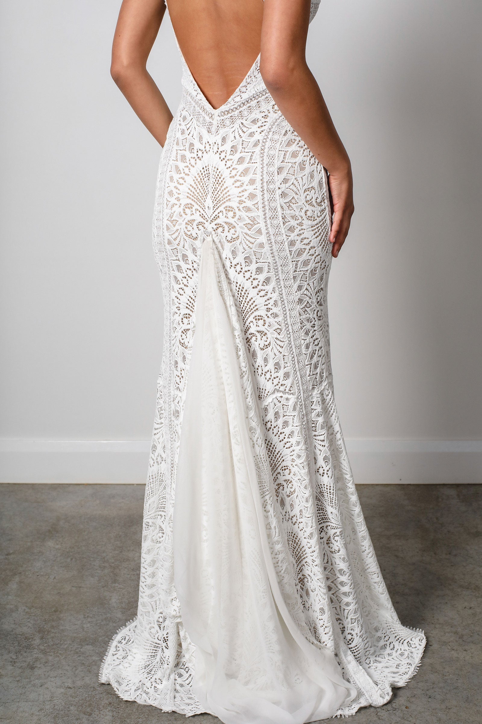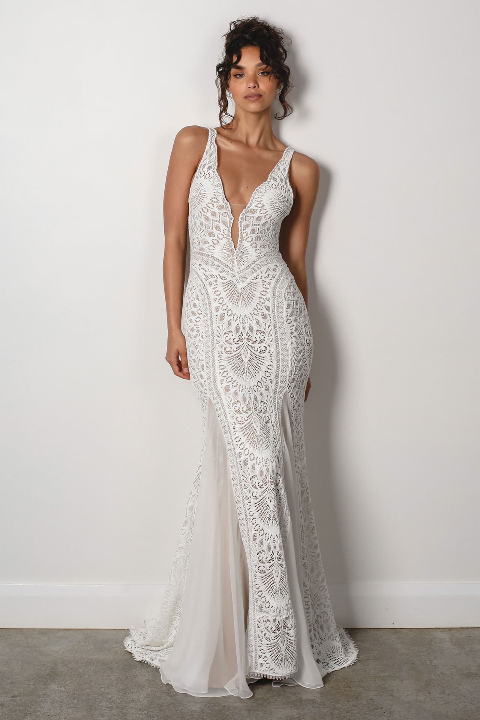 Découvrez un décolleté plongeant, rendu audacieux. Cette robe de mariée en dentelle présente des bordures géométriques complexes qui ajoutent de la dimension.