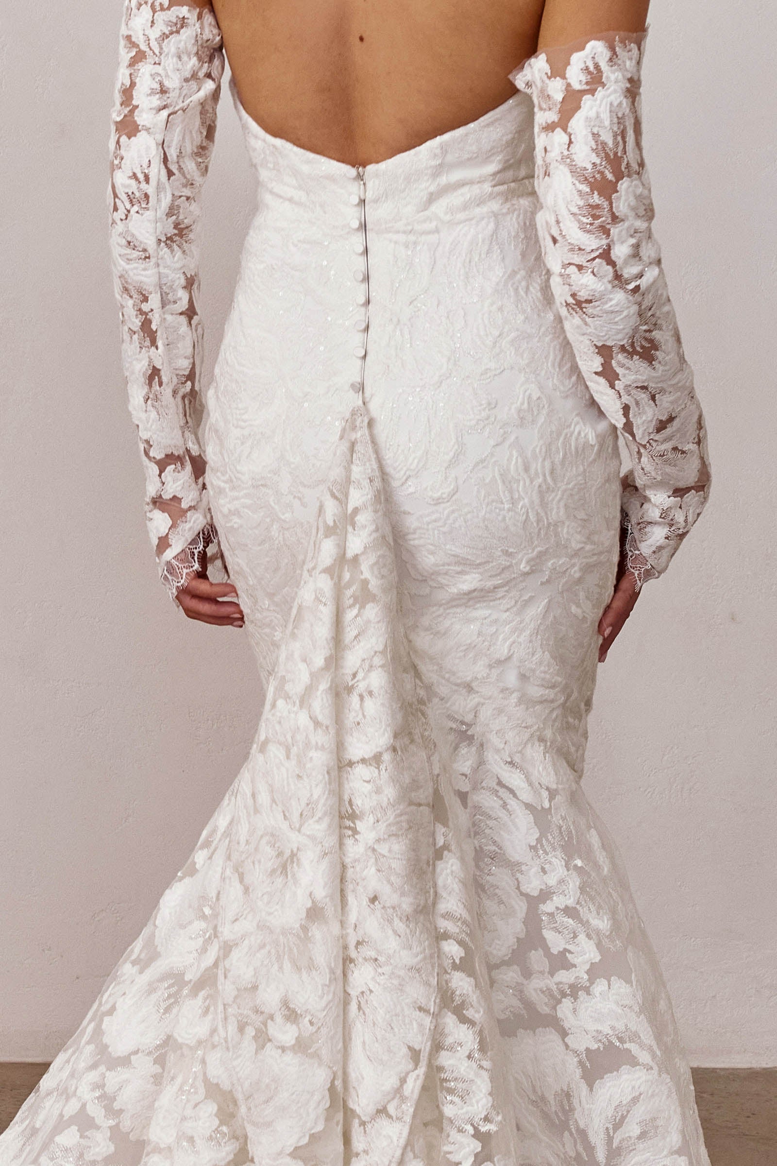 Opaline is a celebration of the woman. This mermaid wedding dress is designed for impact, with an exaggerated fit-and-flare silhouette that snatches every curve.