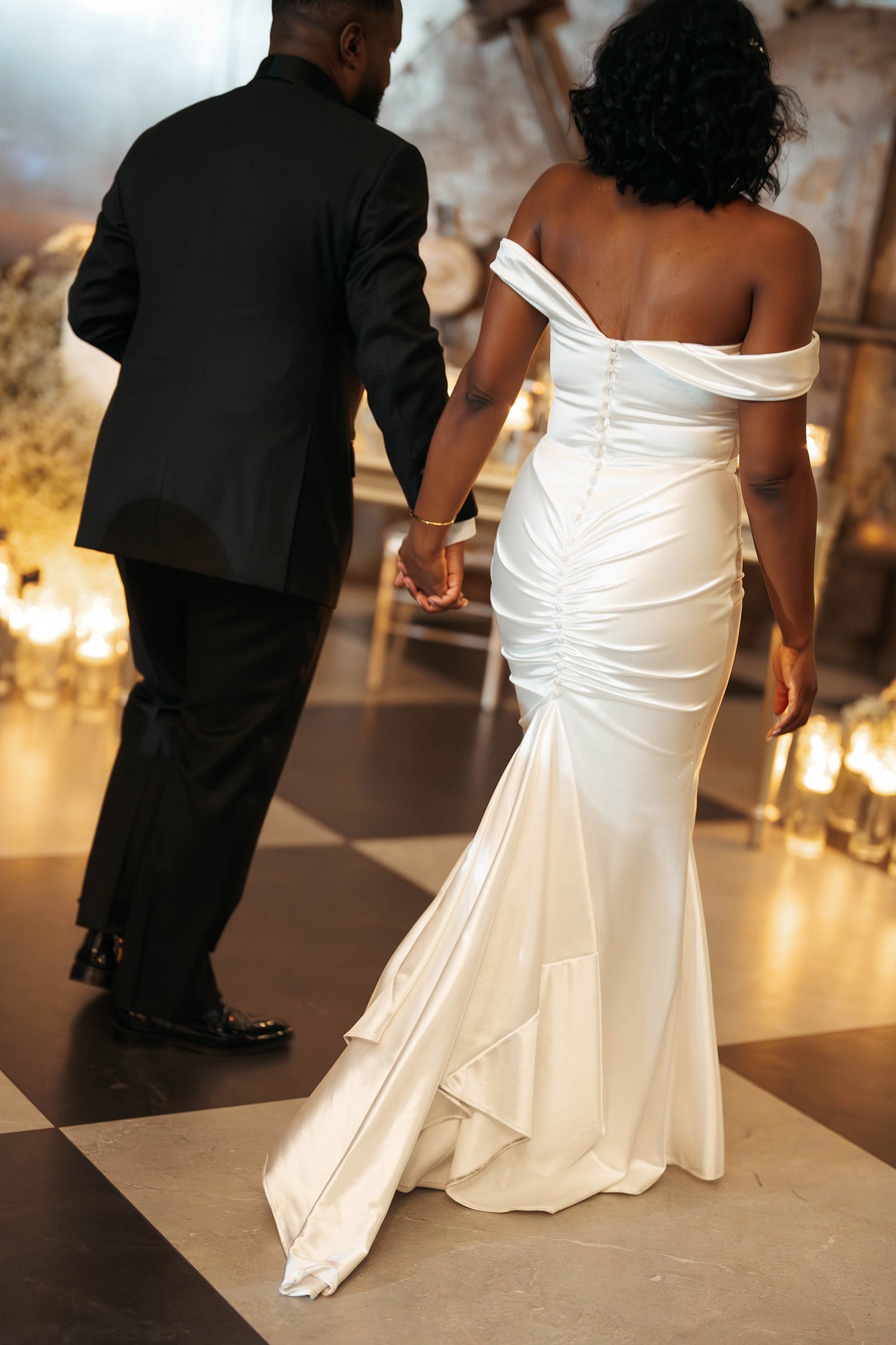Old Hollywood glamour is brought to life with Cupid. Designed in a pearlescent stretch satin, this luminescent gown gives lustre and dimension while maintaining the comfort and agility our gowns are known for.