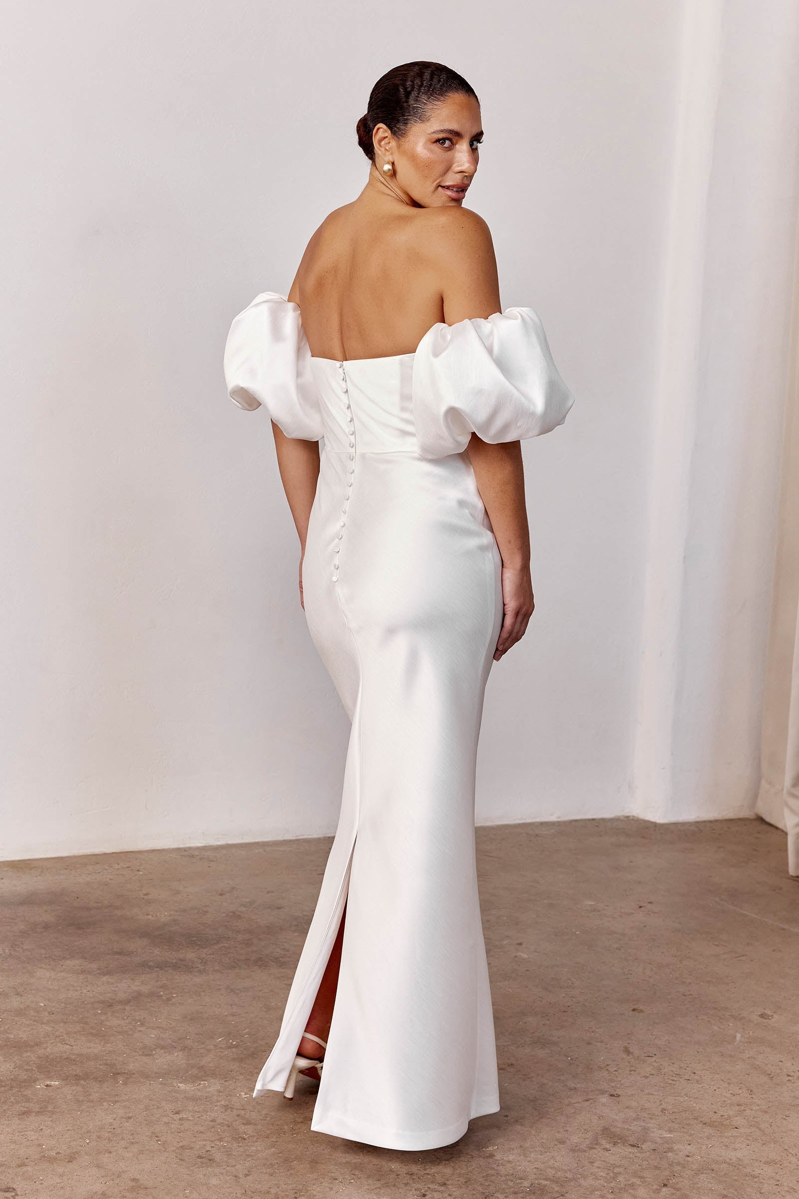 All eyes on Emory, a modern take on the puff-sleeve. Made for rehearsal dinners, wedding receptions and every event in between, she's a casual wedding dress that still makes a statement.