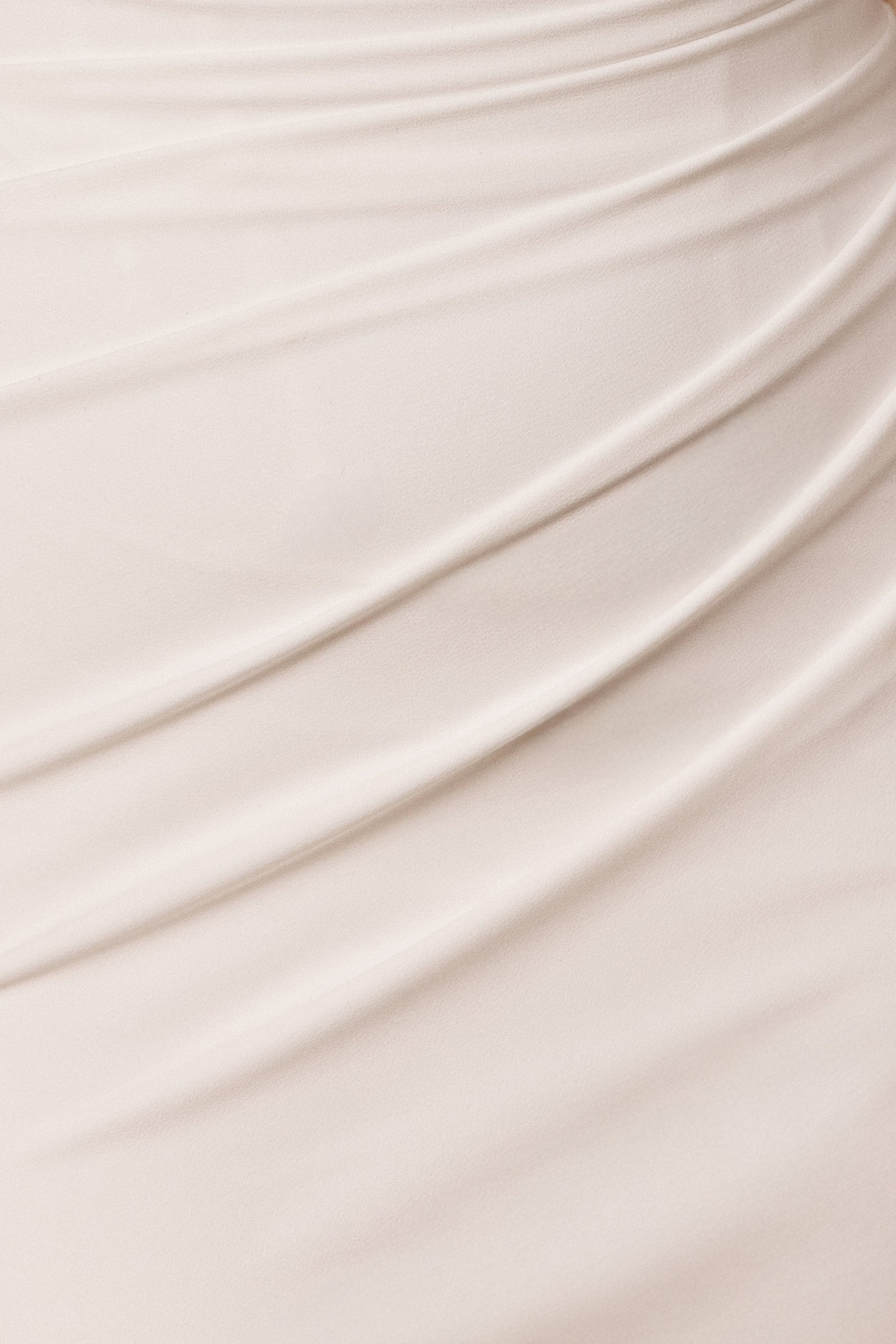 The halter neckline elongates the bodice, while thoughtful pleat details ensure you feel your most confident. Lauren’s dipped V-back is framed with crepe straps that accentuate the back and support the waist and bodice with ease.