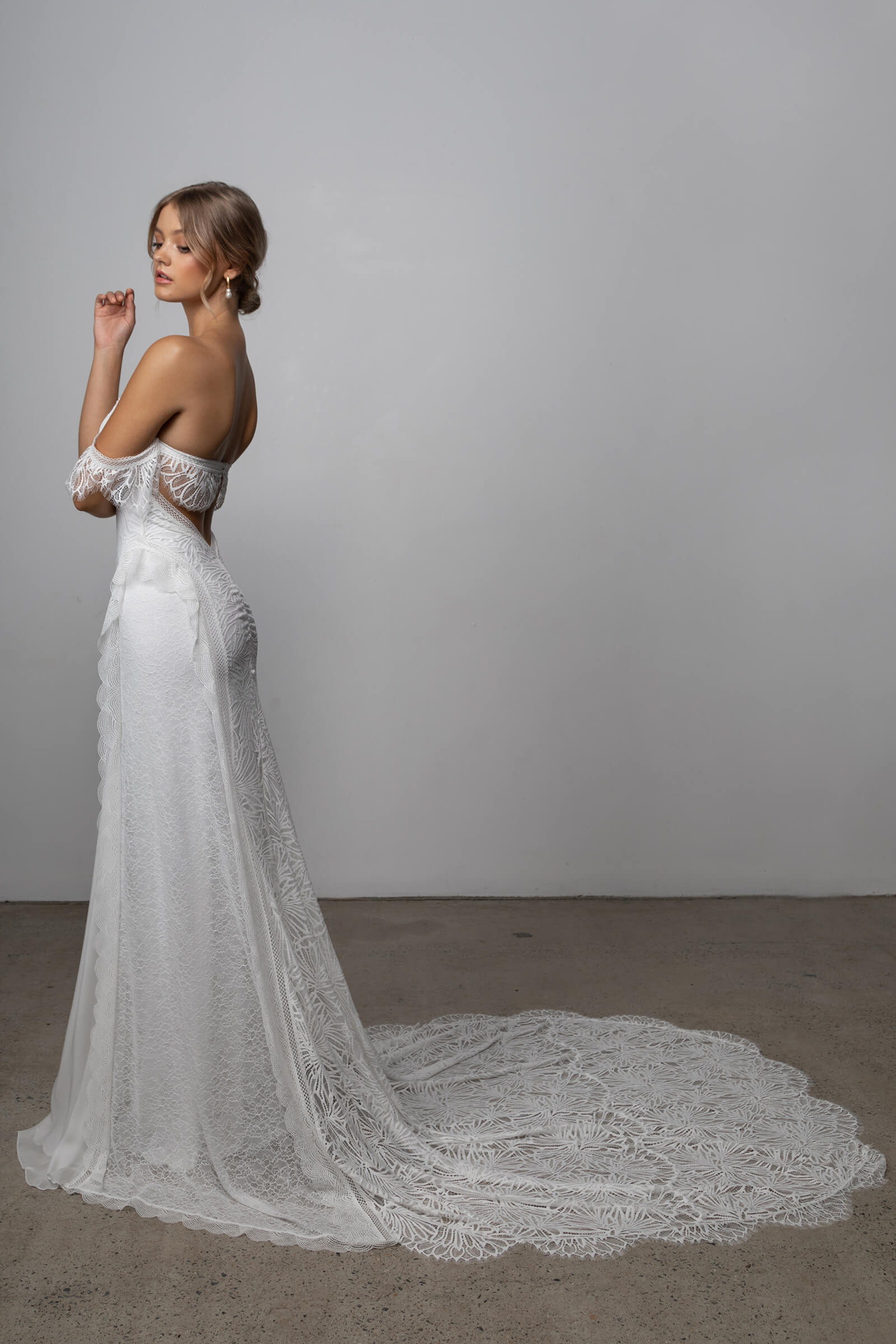 This lace wedding dress is effortlessly balanced and detailed with off-the-shoulder scalloped edge armbands and back strap, bringing to life a bohemian feel.